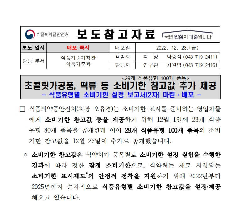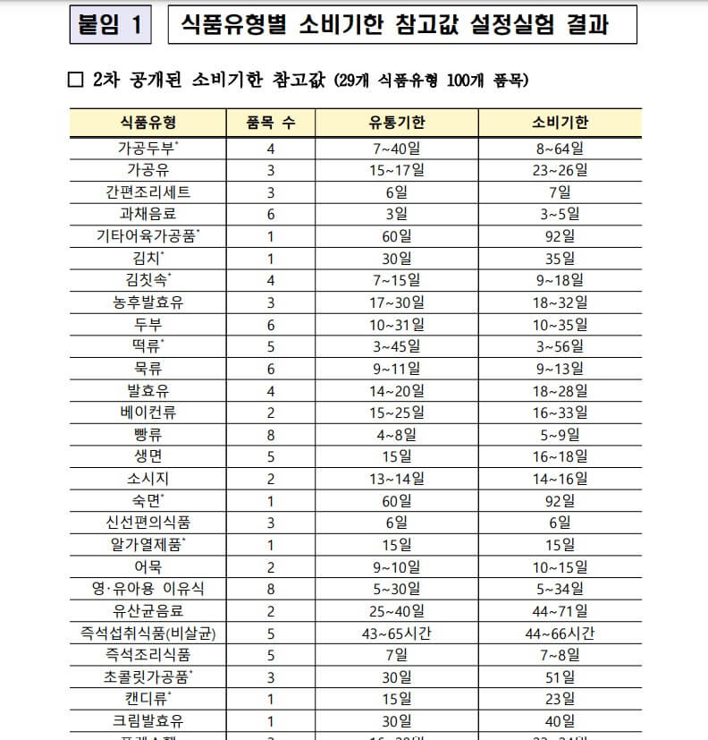 여러 품목이 순차적으로 소비기한으로 변경되어 유통될 예정으로 식약처에서는 순차적으로 식품의 소비기한에 대한 평균값을 공개할 예정입니다. 일반적으로 유통기한이 짧았던 우유는 8일, 두부는 4일 정도 기간이 늘어나고 소시지나 어묵은 10일 이상 섭취 가능 기간이 늘어납니다.